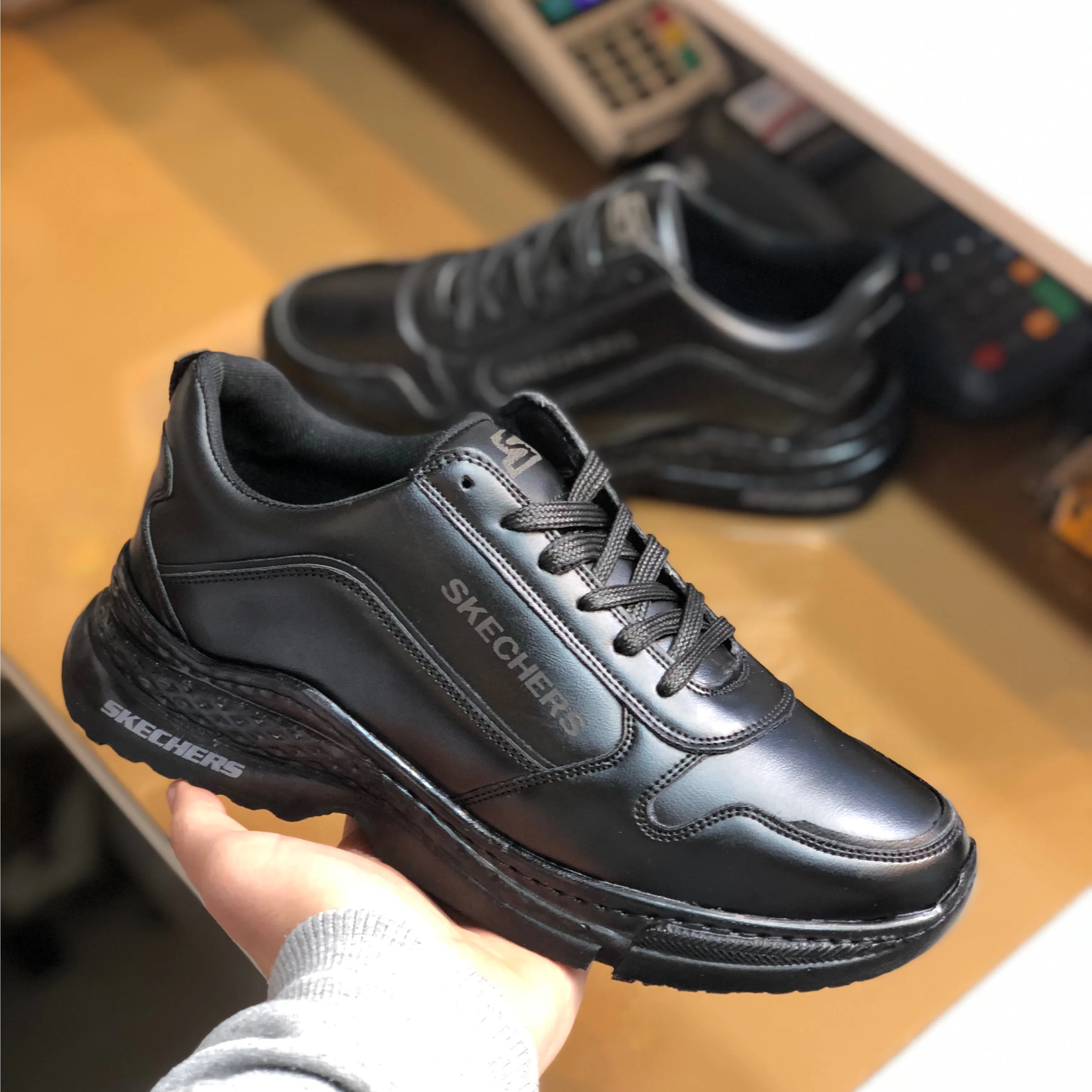کفش اسپرت مردانه چرم صنعتی زیره پیو طبی سبک راحت طرح اسکچرز مشکی