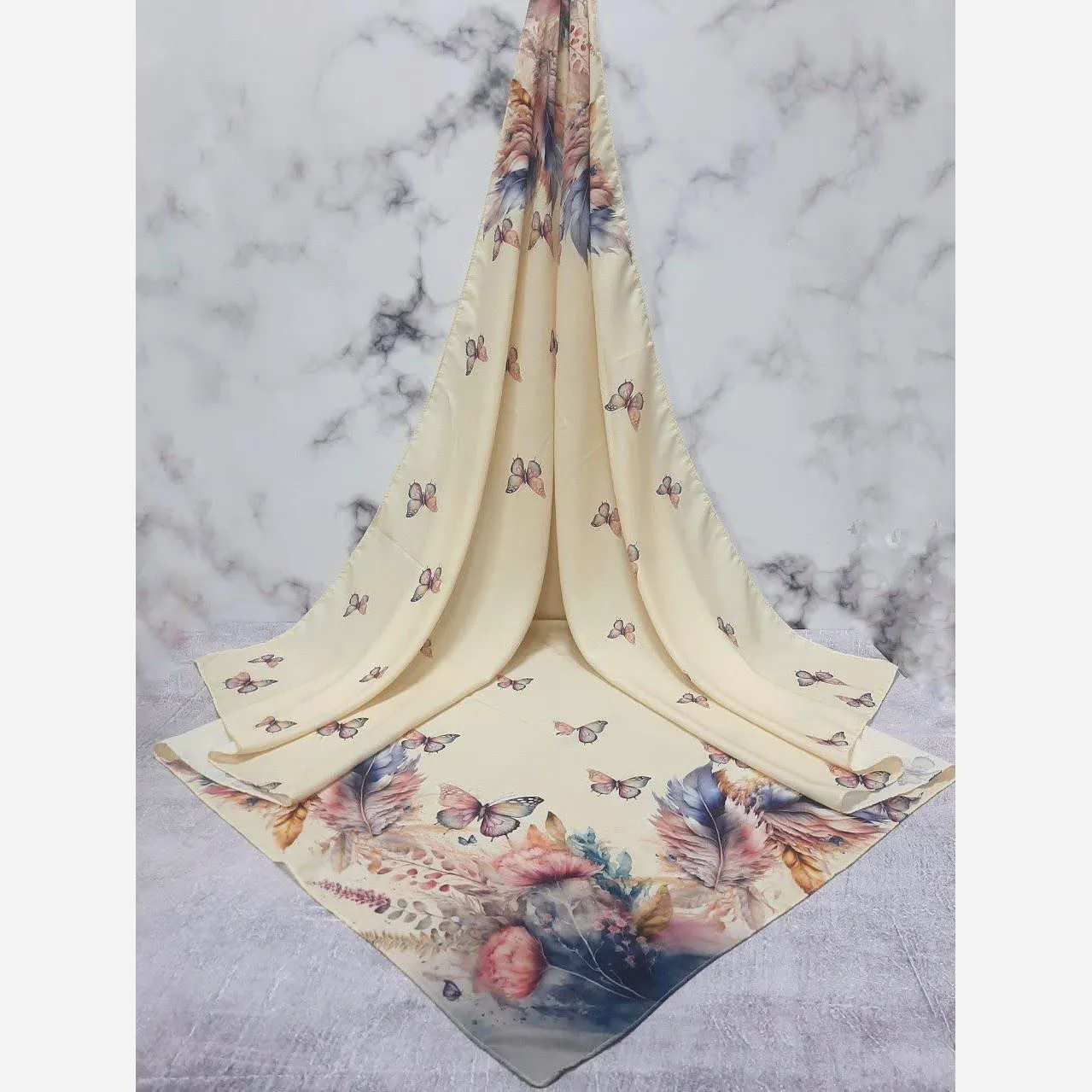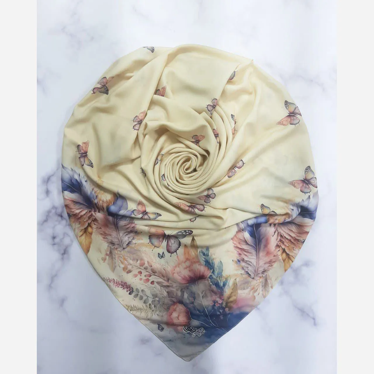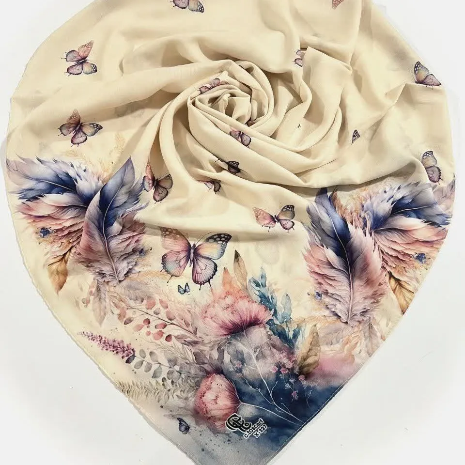 روسری طرح پردیس با ابعاد 140 سانتیمتر، انتخابی ایدهآل برای تکمیل استایل شماست. این روسری با طرح زیبای پروانه و پر، جلوهای خاص و چشمنواز به استایل شما میبخشد.