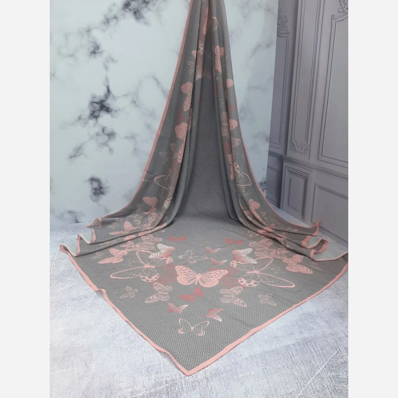 روسری نخی طرح پروانه طوسی صورتی قواره بزرگ 140 سانتیمتر لیز نیست