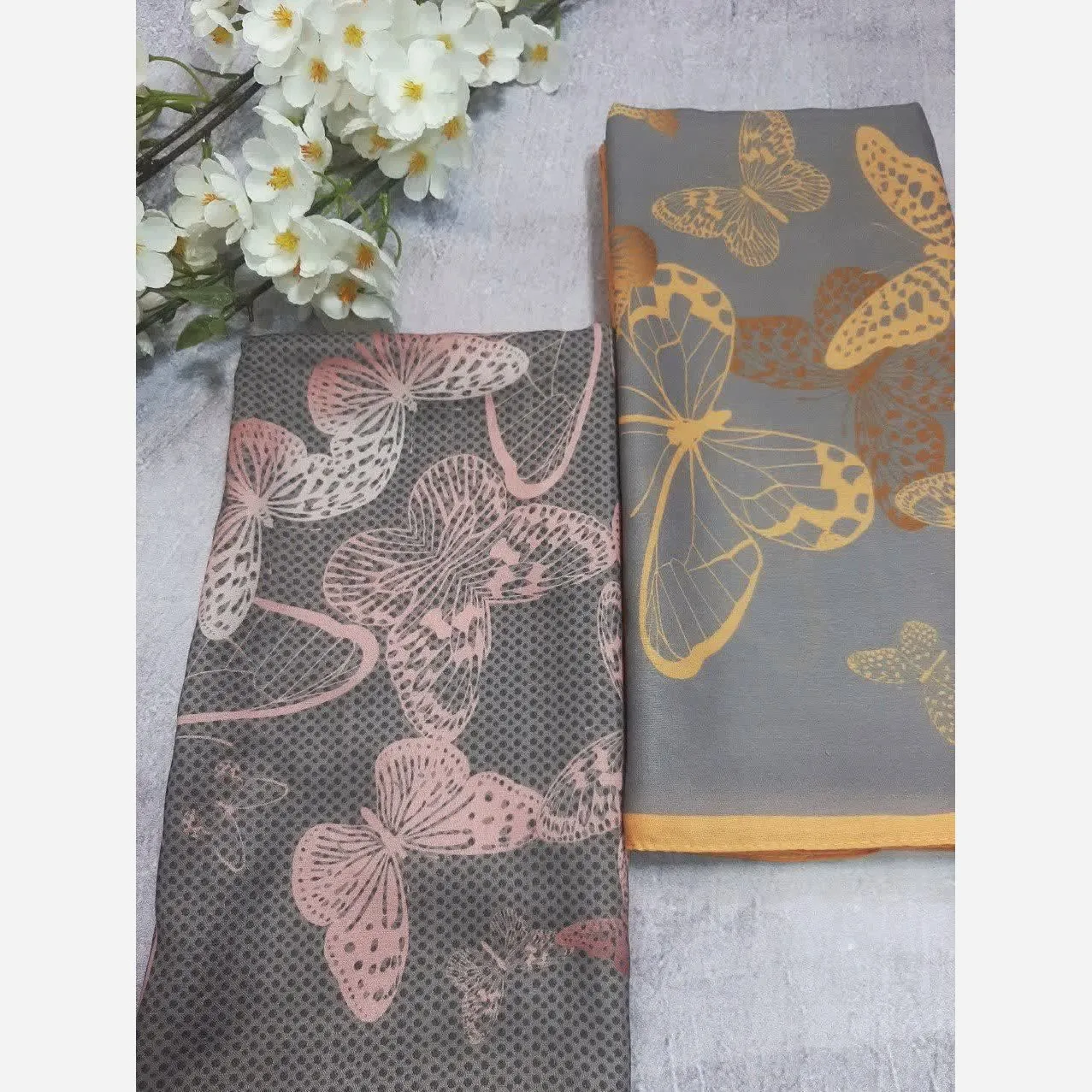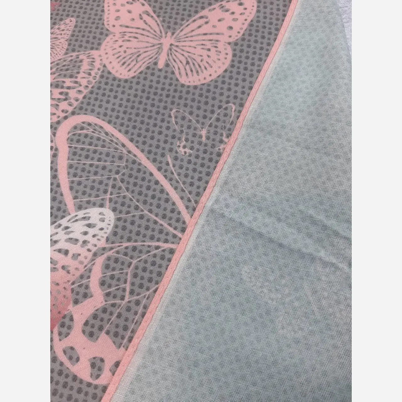 روسری نخی طرح پروانه با ترکیب رنگهای طوسی و صورتی، انتخابی ساده و شکیل برای تکمیل استایل شماست. این روسری با طرح خالخالی و جزئیات پروانه، زیبایی خاصی به ظاهر شما میبخشد.