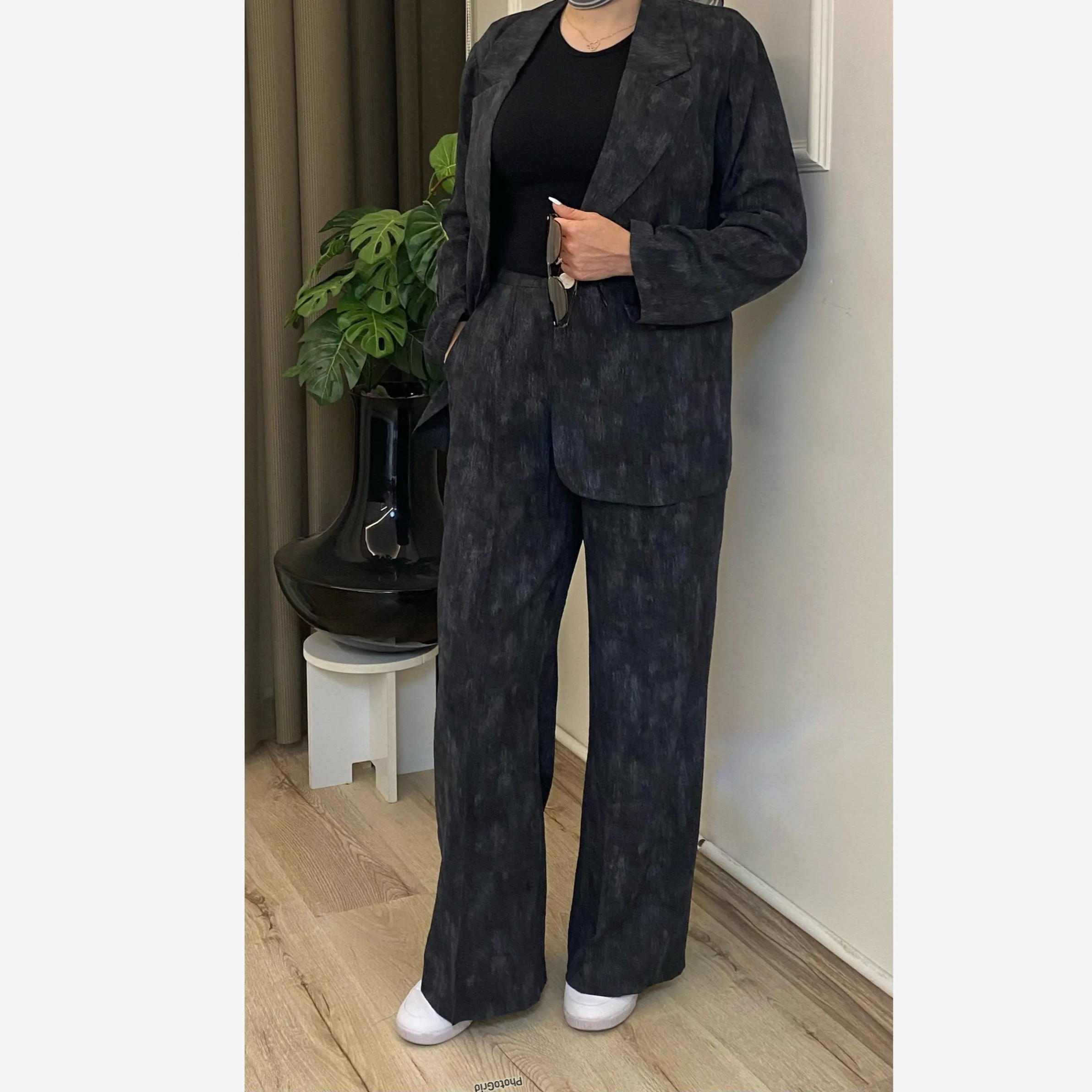 این کت و شلوار زنانه با جنس شانتون گازوئیلی درجه یک، انتخابی ایدهآل برای استایلهای شیک و مجلسی است. رنگ مشکی کلاسیک و پرکاربرد این ست، امکان هماهنگی آسان با انواع اکسسوریها را فراهم میکند.
