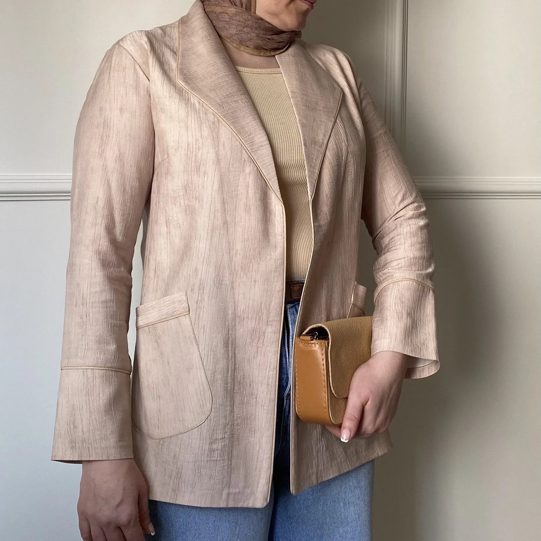 این کت زنانه شیک با رنگ کرم دلنشین، از پارچه با کیفیت شانتون گازوییلی تهیه شده است. طراحی آستردوزی کامل این محصول، علاوه بر افزایش دوام، راحتی بینظیری را هنگام استفاده فراهم میکند.