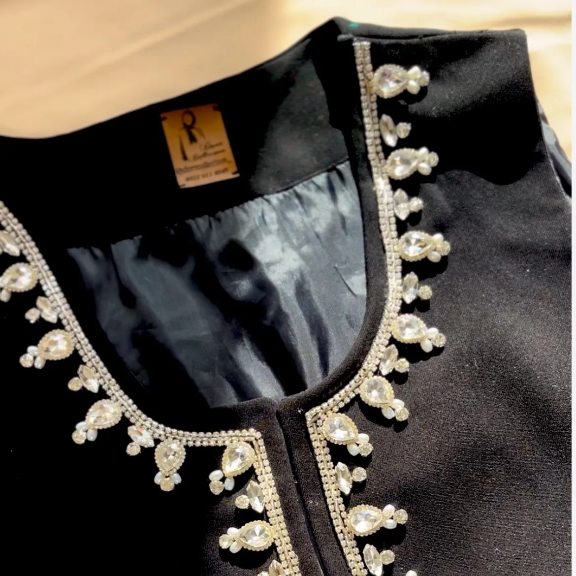 جنس پارچه از كرپ كنزو كج راه درجه يك (فوق العاده مشکی ) جواهرات بادست دوخته شده