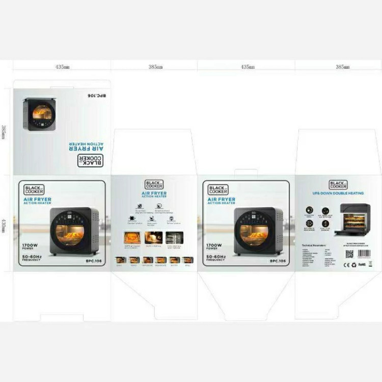 سرخکن دیجیتال بلک کوکر مدل BC-106AF یک هواپز قدرتمند با ظرفیت بزرگ 14.5 لیتر است که بدون نیاز به روغن کار میکند. این دستگاه دارای توان 1700 وات، بدنه استیل ضد زنگ، پنل لمسی دیجیتال، تنظیم دما و زمان، و قابلیت جوجهگردان میباشد.